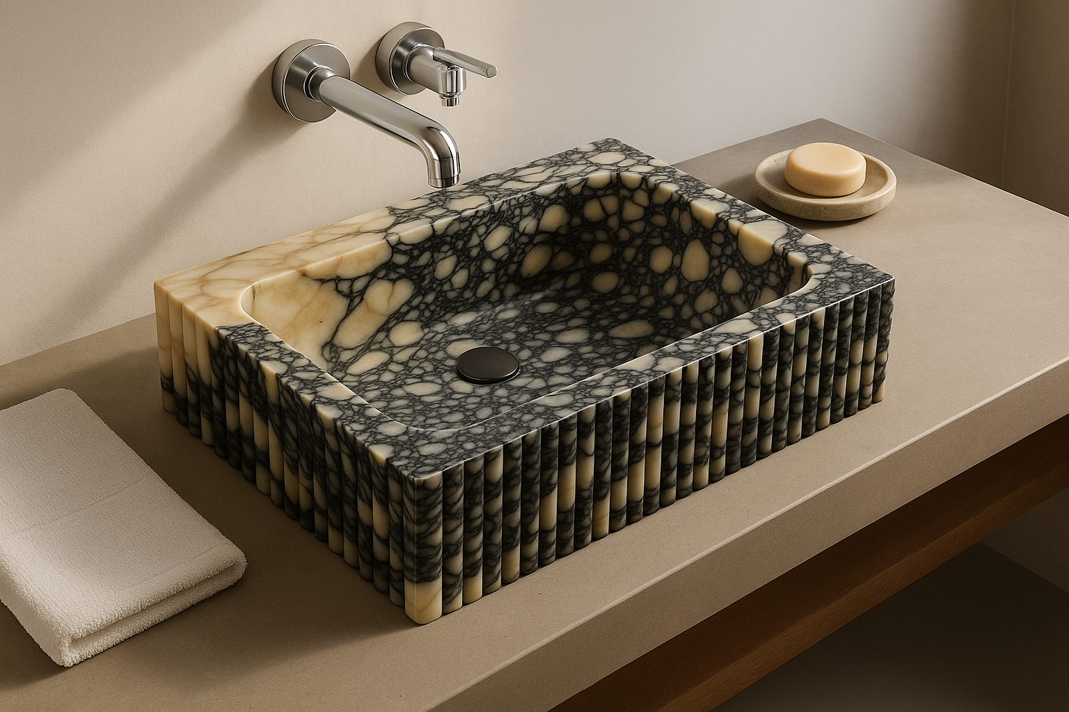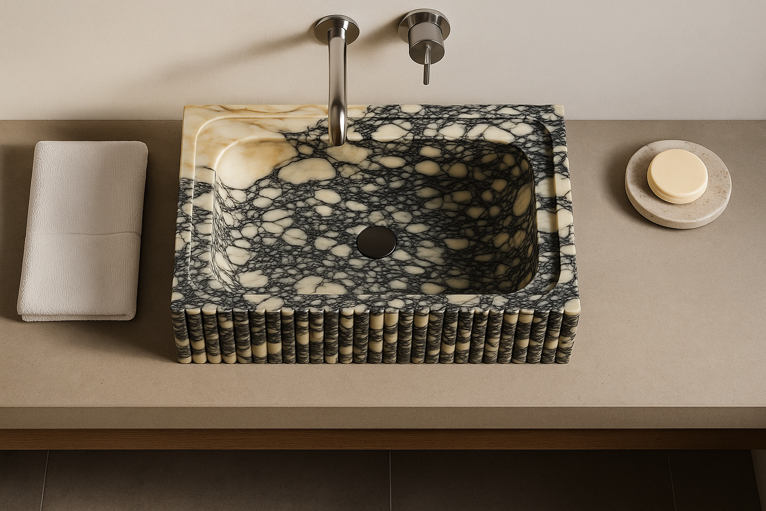 Make a bold architectural statement with the LINEA sink, handcrafted from striking Black & Beige Spider Calacatta Viola. Featuring fluted vertical lines and dramatic natural veining, this sink blends modern minimalism with timeless craftsmanship — ideal for luxury bathrooms, boutique hotels, or interior design projects that demand artistic expression.